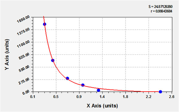 ELISA操作步驟復(fù)雜,影響反應(yīng)因素較多,特別是固相載體的包被難達(dá)到各個(gè)體之間的一致,因此在定量測定中,每批測試均須用 一系列不同濃度的參考標(biāo)準(zhǔn)品在相同的條件下制作標(biāo)準(zhǔn)曲線。測定大分子量物質(zhì)的夾心法ELISA,標(biāo)準(zhǔn)曲線的范圍一般較寬, 曲線最高點(diǎn)的吸光度可接近2.0,繪制時(shí)常用半對數(shù)值,以檢測物的濃度為橫坐標(biāo),以吸光度為縱坐標(biāo),將各濃度的值逐點(diǎn)連接, 所得曲線一般呈S形,其頭、尾部曲線趨于平坦,中央較呈直線的部分是最理想的檢測區(qū)域。測定小分子量物質(zhì)常用競爭法, 其標(biāo)準(zhǔn)曲線中吸光度與受檢物質(zhì)的濃度呈負(fù)相關(guān)。標(biāo)準(zhǔn)曲線的形狀因試劑盒所用模式的差別而略有不同。ELISA測定的標(biāo)準(zhǔn)曲線注意圖中 橫坐標(biāo)為對數(shù)關(guān)系,這更有利于測定系統(tǒng)的表達(dá)。