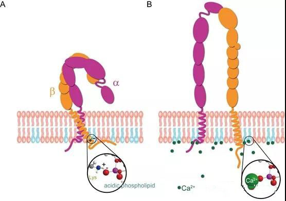 在靜息狀態(tài)下,酸性磷脂通過與?2-K702和?L形成三元相互作用穩(wěn)定跨膜區(qū)異源二聚體構(gòu)象,從而將整合素維持在低親和力構(gòu)象。T細(xì)胞活化引起鈣離子內(nèi)流,內(nèi)流的鈣離子通過與酸性磷脂競(jìng)爭(zhēng)性結(jié)合,打破靜息狀態(tài)下的三元靜電作用,引起整合素跨膜區(qū)異源二聚體的分離...